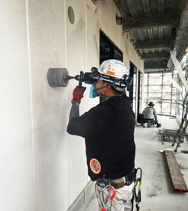 ダイヤモンドコアビットを使用し、鉄筋コンクリートなどの構造物をはじめ、様々な材質の構造物を穿孔します。弊社では大口径から小口径まで様々な現場に対応でき、コアを連続して穿孔することによる大きな開口の施工も可能です。コンクリート以外のコア抜きも対応いたしますので是非、ご相談下さい。