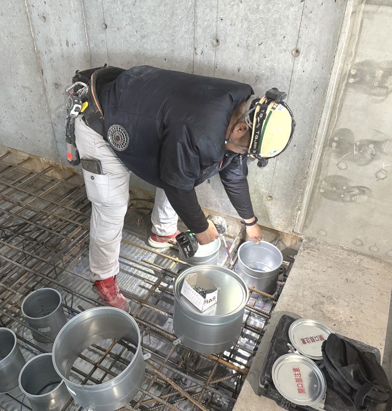 コンクリート打設前に、空調・衛生・電気工事で使用するスリーブ・インサートを設置します。その他にもアンカー工事、アンカー引張試験、はつり工事、資機材搬出入、養生・清掃、コンクリート打設相番など幅広く対応いたします。